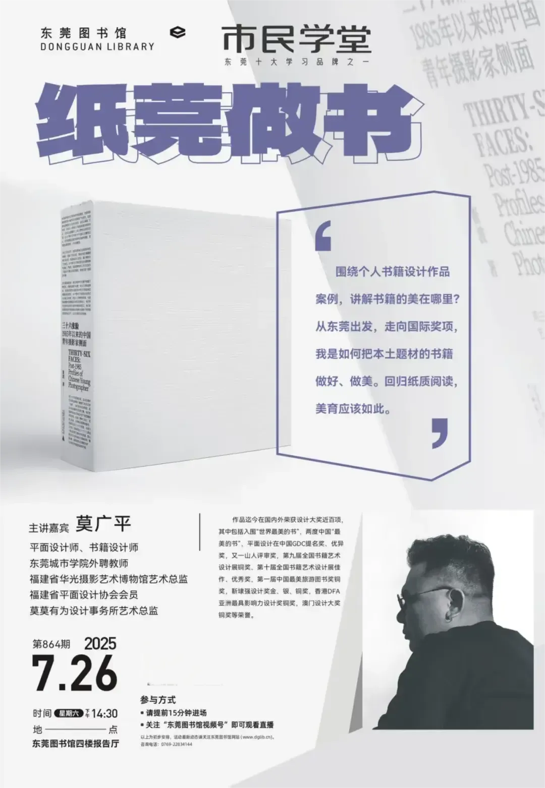 本周末市民学堂第864期活动,将邀请书籍设计师莫广平老师莅临现场,为广大市民朋友介绍国际、国内和东莞的书籍设计状况。莫广平老师将围绕个人书籍设计作品案例,讲解书籍之美,并分享其书籍设计之路——从第一次遇见“书籍之美”展览,到荣获中国“最美的书”奖项、负责第十届“书籍之美”展览的创意策划,再到入围“世界最美的书”,莫广平老师一路走来,从未停止对书籍设计的热爱和追求。精彩分享,敬请期待!