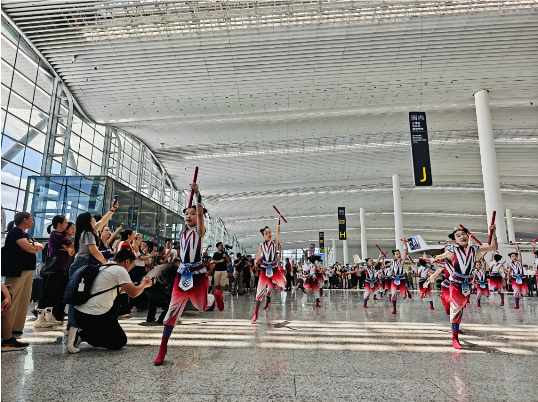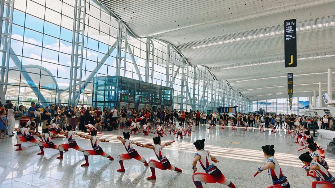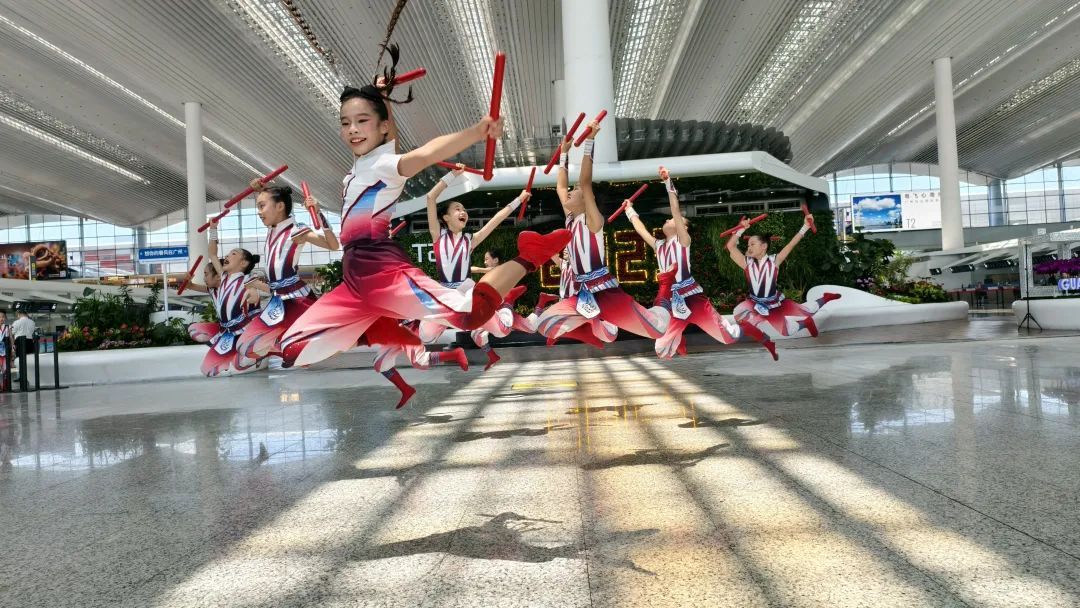 7月26日,广州白云机场T2航站楼内一群少年以传统英歌舞点燃旅客热情,外国游客詹姆斯举起手机连声赞叹:“这比任何表演都动人!”进入暑假以来,白云机场进出港航班和旅客数据不断攀升,7月1日至7月25日,白云机场共计起降共计起降航班3.9万架次,同比增长7.76%。接送旅客576.2万人次,同比增长7.34%。(注:以上数据均为快报数)