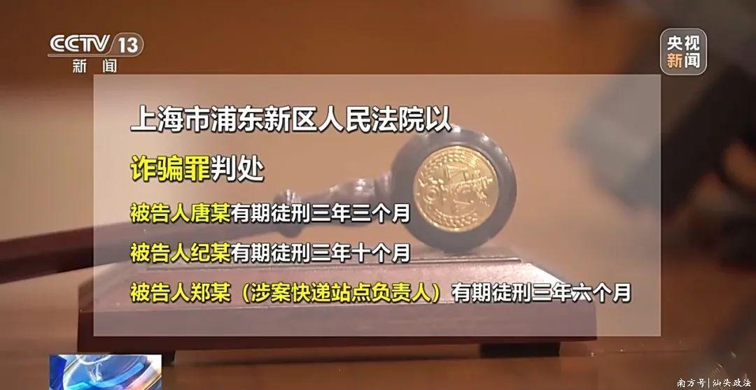2024年4月至7月,上海市浦东新区人民法院以诈骗罪,对本案的唐某、纪某以及涉案韵达快递站点负责人郑某等被告人分别判处有期徒刑三年十个月至三年不等。