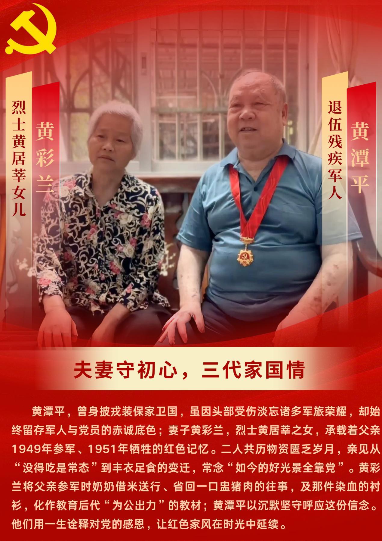 黄彩兰的丈夫黄潭平,也是一位中国共产党党员,年轻时投身军旅、头部负伤,虽已年迈、记忆模糊,却仍不忘当年的军人身份。尽管许多战斗细节已从记忆中淡出,但“我是党员”“我当过兵”始终是他最自豪的身份标签。