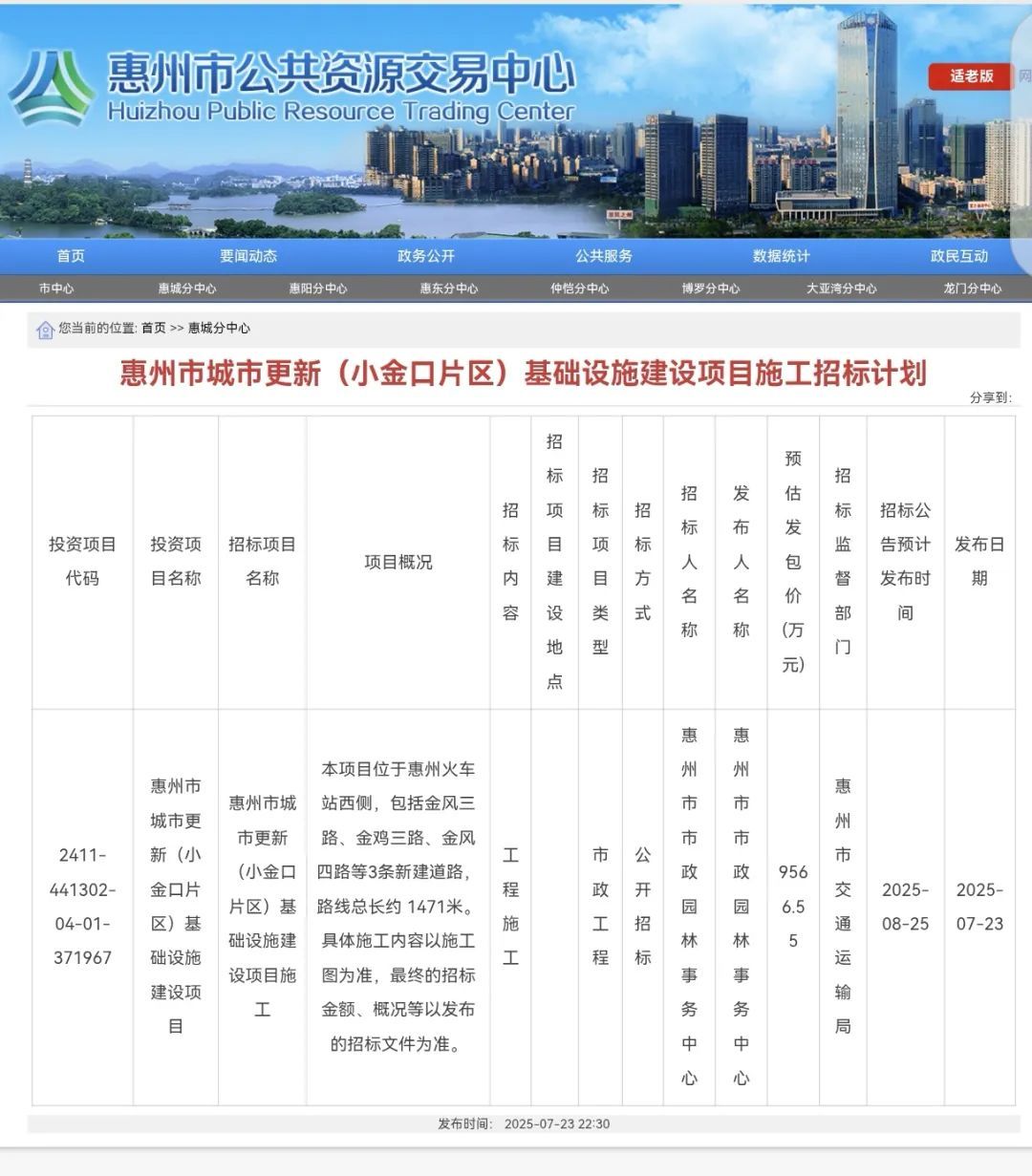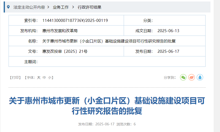 根据今年6月惠州市发改局批复的《惠州市城市更新(小金口片区)基础设施建设项目可行性研究报告》,原则同意由惠州市市政园林事务中心负责组织实施惠州市城市更新(小金口片区)基础设施建设项目。