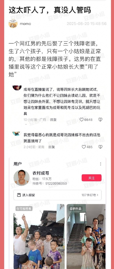 近日,有网友发文称,“男网红‘农村成哥’先后娶了三个残障老婆,生了六个孩子,只有一个小姑娘正常。这个男的在直播里说等正常小姑娘长大要‘用了她’。”相关信息引发广泛关注。